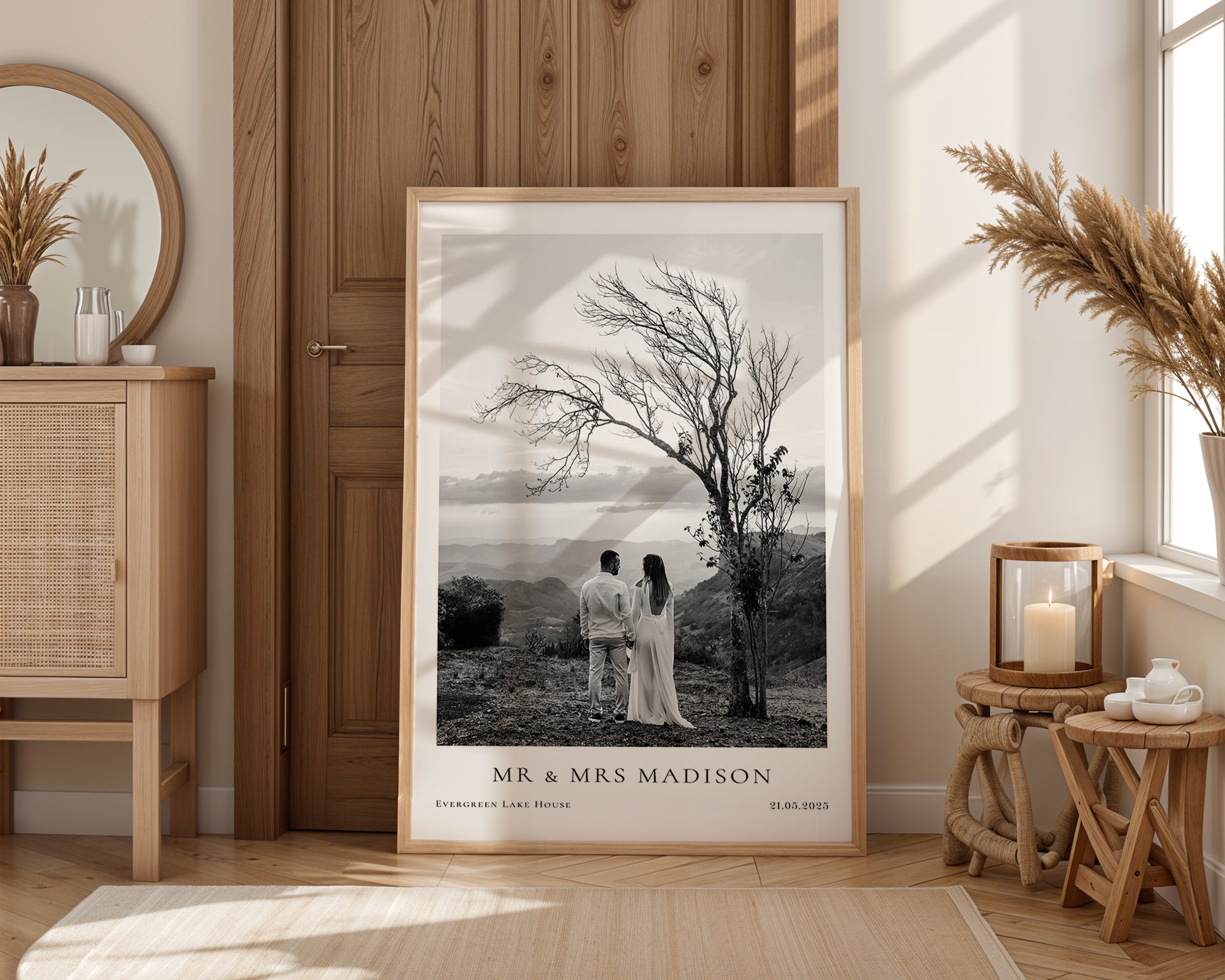 Remember your special day with our custom wedding print displaying a wedding photo, names, place and date.